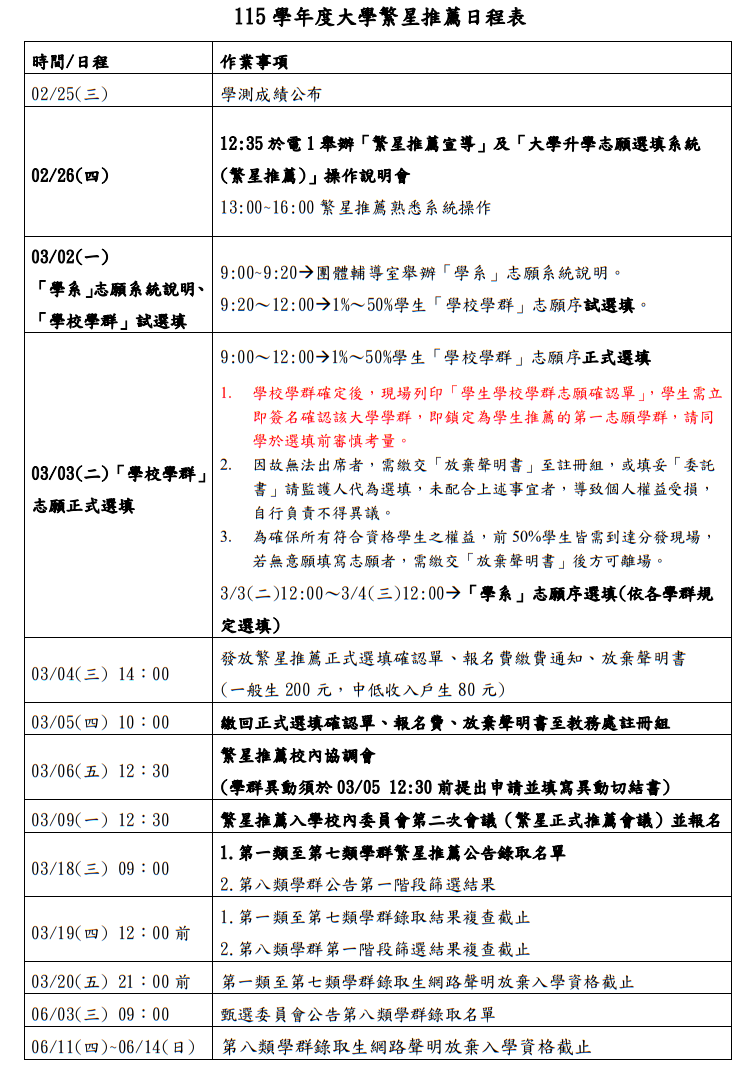 ❗️❗️時程有修改❗️❗️【高三升學-大學繁星】公告本校115學年度大學繁星推薦入學作業實施辦法(日程表1150225更新)